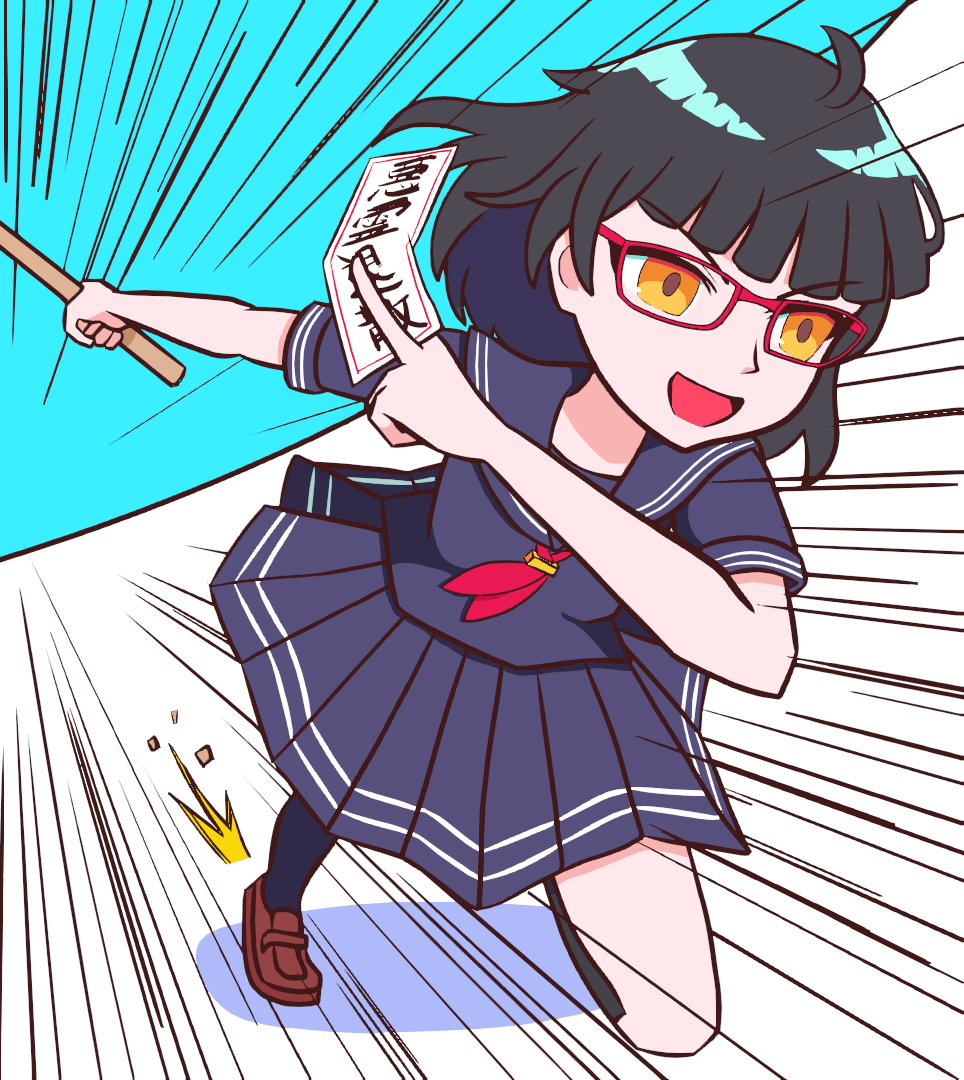 「木刀とお札で町に潜む悪霊なんかを除霊してく系女子高生」という設定どおりのイラストです。今まさに悪霊を見つけて「よっしゃ見つけた!」と嬉々として駆けつけて除霊しようとしているシーンをイメージしました。